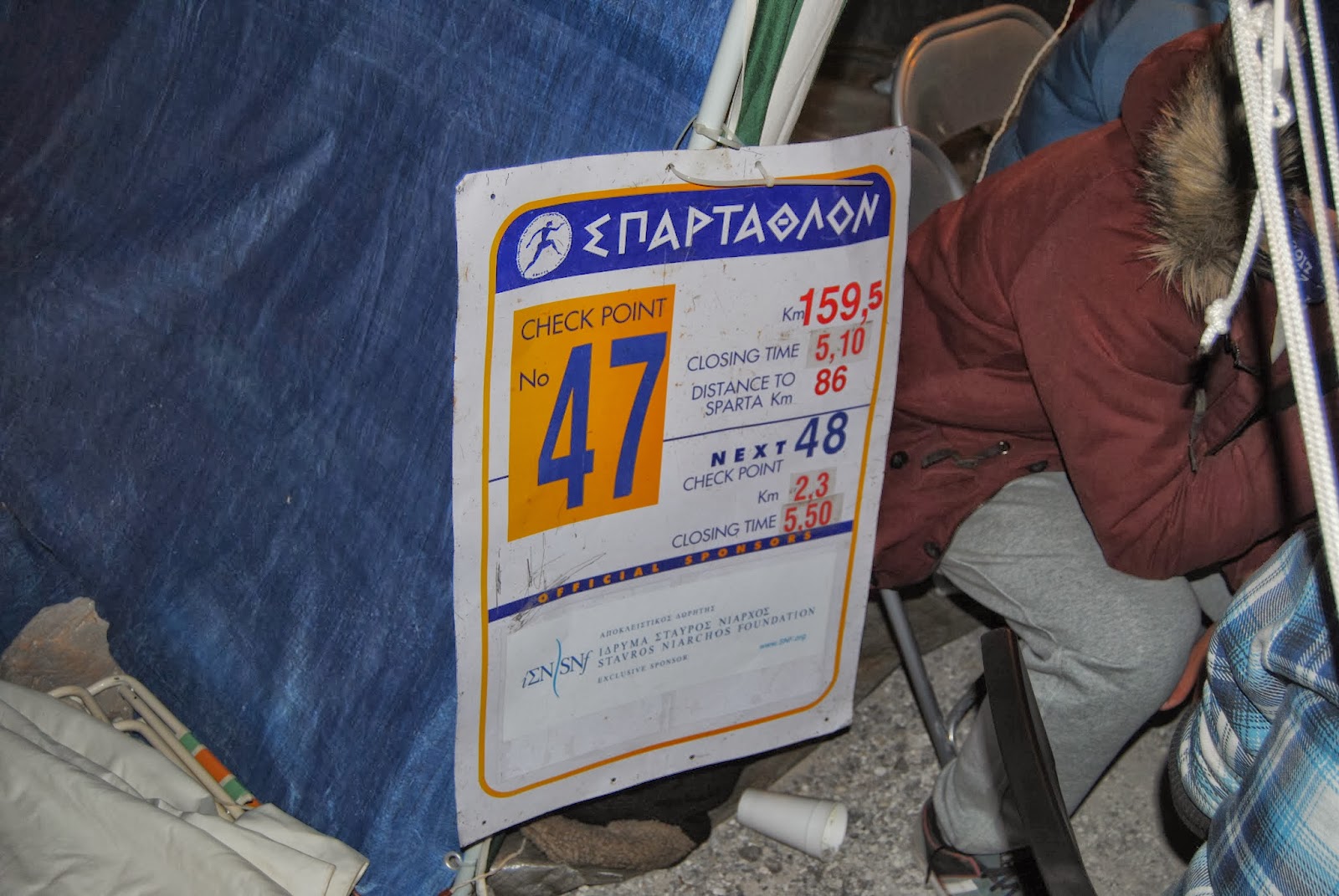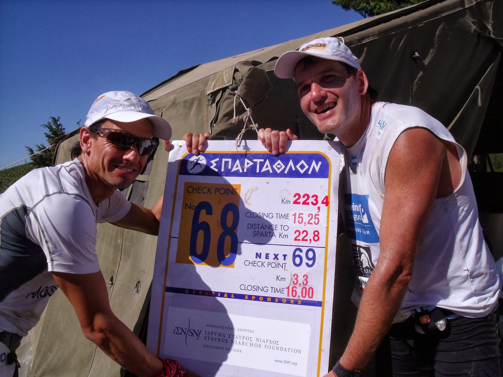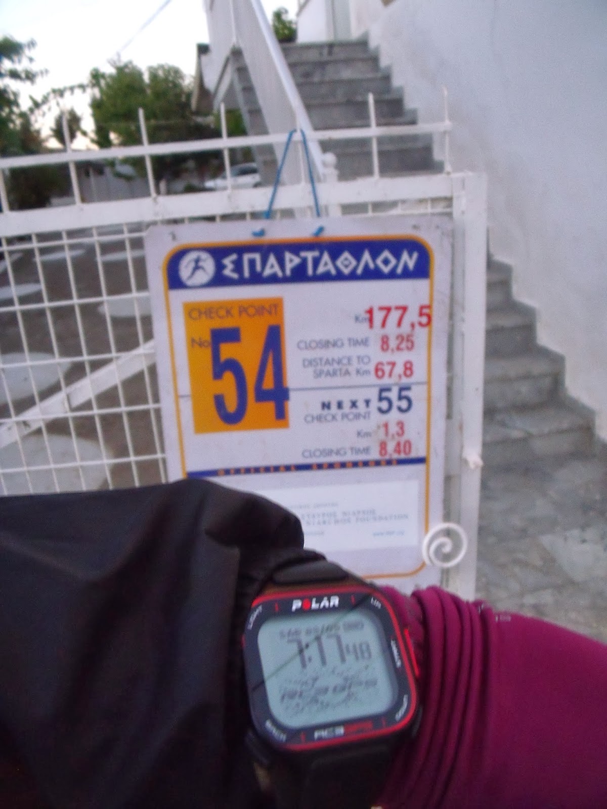Estos últimos kilómetros fueron eternos, pero apareció un cartel que decía que Sparta estaba a 3 kilómetros, y al girar en una curva veo un puente en el que estaba una pancarta enorme que decía “Spartathletes welcome to Sparta”. Me subió algo desde la barriga hasta el pecho en modo de tapón que casi no me dejaba respirar. Y los coches seguían saludando, y todo eso era irreal.