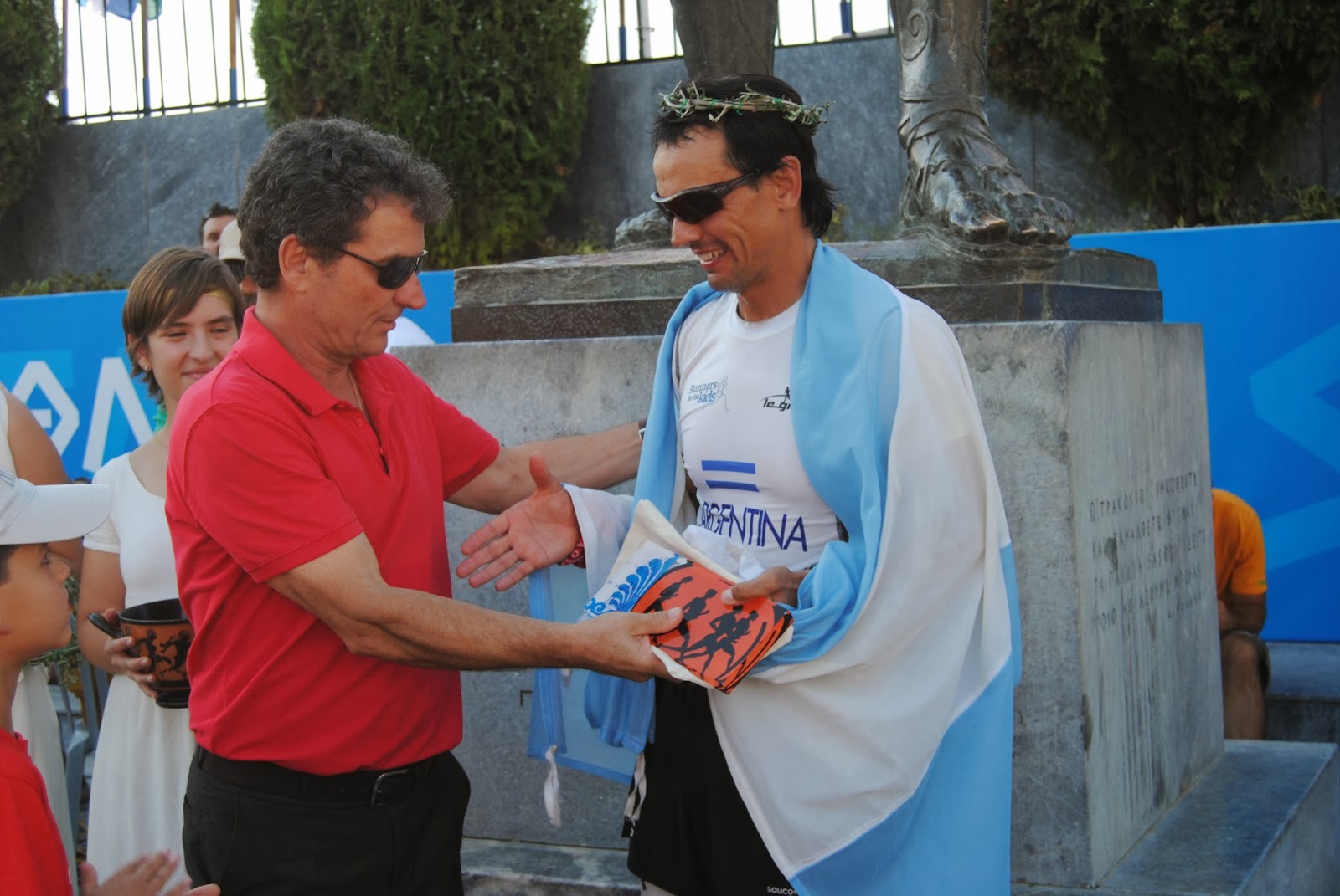 Pasé por debajo del puente y veo que empieza una subida importante, pero había muchos atletas caminando y yo quería llegar solo a los pies de Leonidas, así que no había otra opción que la de correr y pasarlos a todos, ja! ¡Cómo saludaban los coches y las motos que pasaban mientras yo corría cada vez más rápido! Y de repente llega un chico de unos 25 años en bicicleta, y sin decirme nada se pone detrás mío y me empieza a guiar por donde ir, mientras yo veía sin ver las banderas colgadas en el medio de esa avenida, y devolviendo el saludo a la gente que desde sus balcones me saludaban, y los que caminaban por la vereda, y los que estaban en mesas de bar. Vuelvo a doblar por segunda vez a la derecha y apareció todo aquello. Todo eso era irreal, como un sueño, como estar viendo un video en 3D. Había mucha mucha gente y al fondo de todo estaba Leonidas, erguido majestuoso, con las banderas de todos los países atrás.